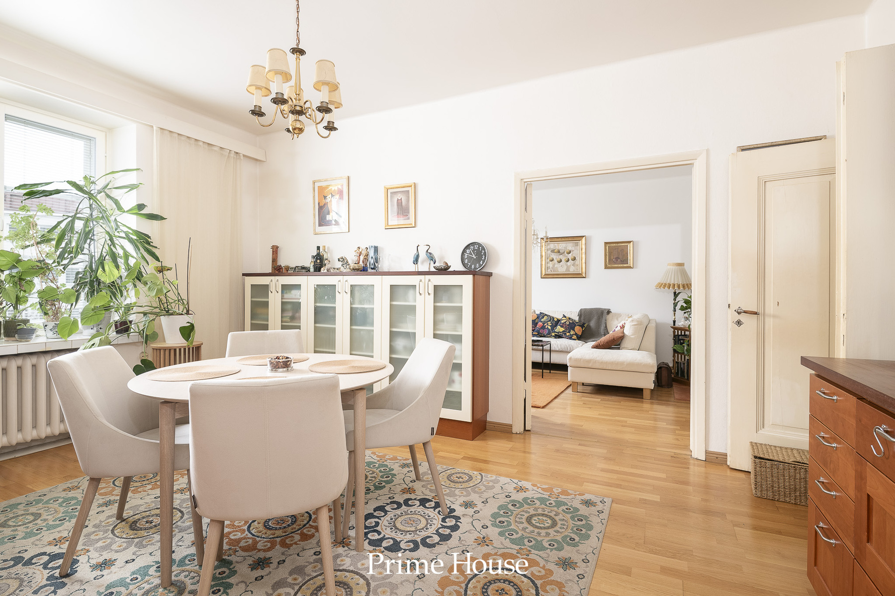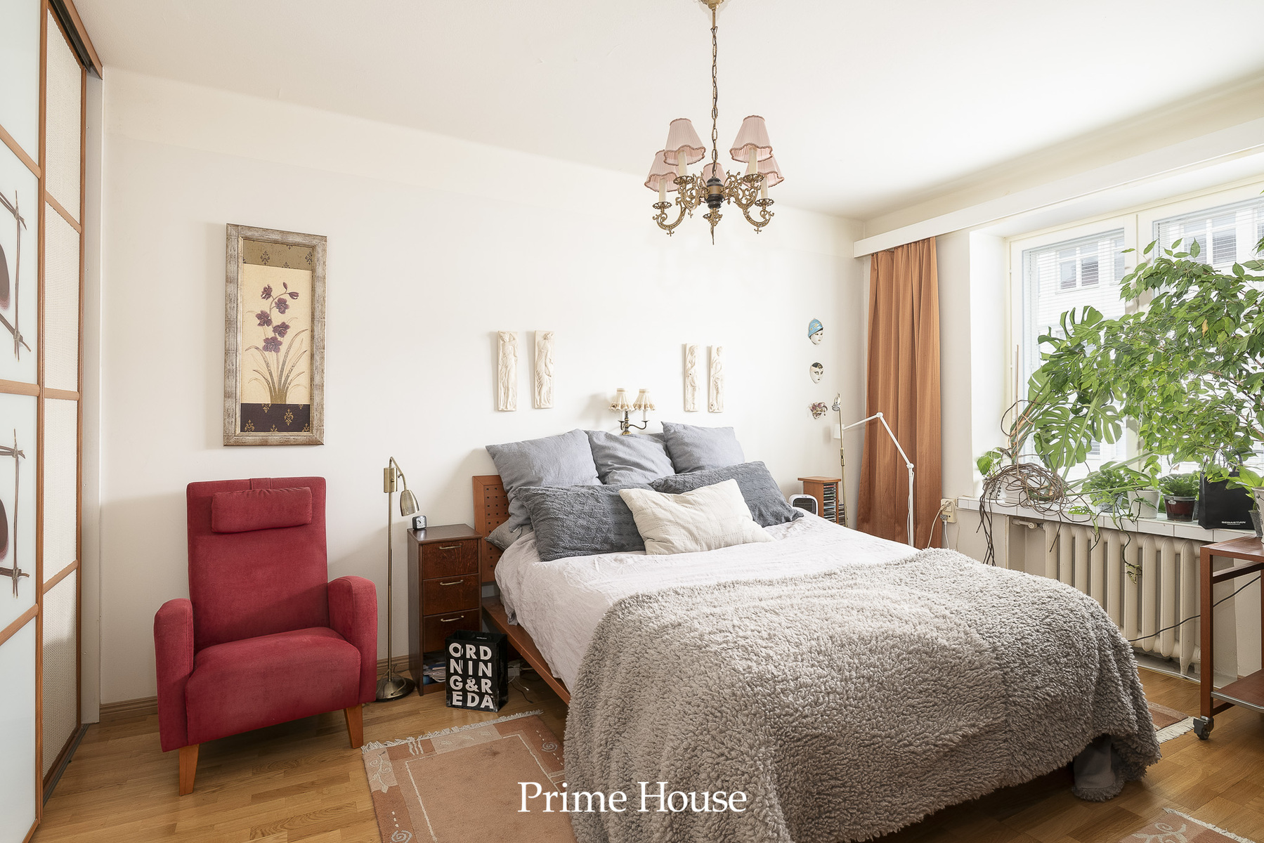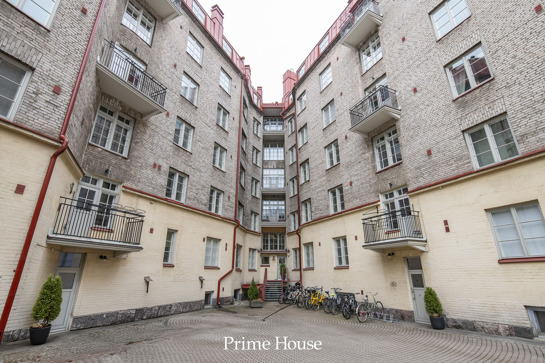 Alkuperäinen sisäänkäynnin ovi toivottaa sinut tervetulleeksi tähän neljännen kerroksen tilaihmeeseen. Lähes 70 neliön kaksio tarjoaa väljyyttä ja toimivan pohjaratkaisun. Asunnosta avautuvat kaupunkinäkymät länteen. Kaikki kolme huonetta ovat lähes samankokoisia mukaan lukien keittiö. Tämän kodin sydän on keskelle sijoittuva keittiö, jossa on tilaa seurusteluun sekä useammallekin kokille. Makuuhuoneessa on mukavasti kaappitilaa koko seinän leveydeltä. Kylpyhuone yllättää toimivuudellaan, kaikki arjen tarpeet ja toiminnat on saatu mahtumaan pyykinpesusta lähtien.