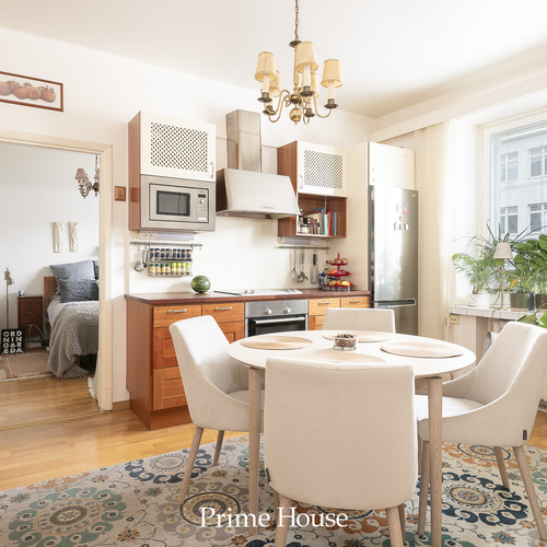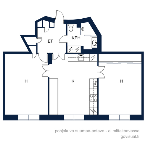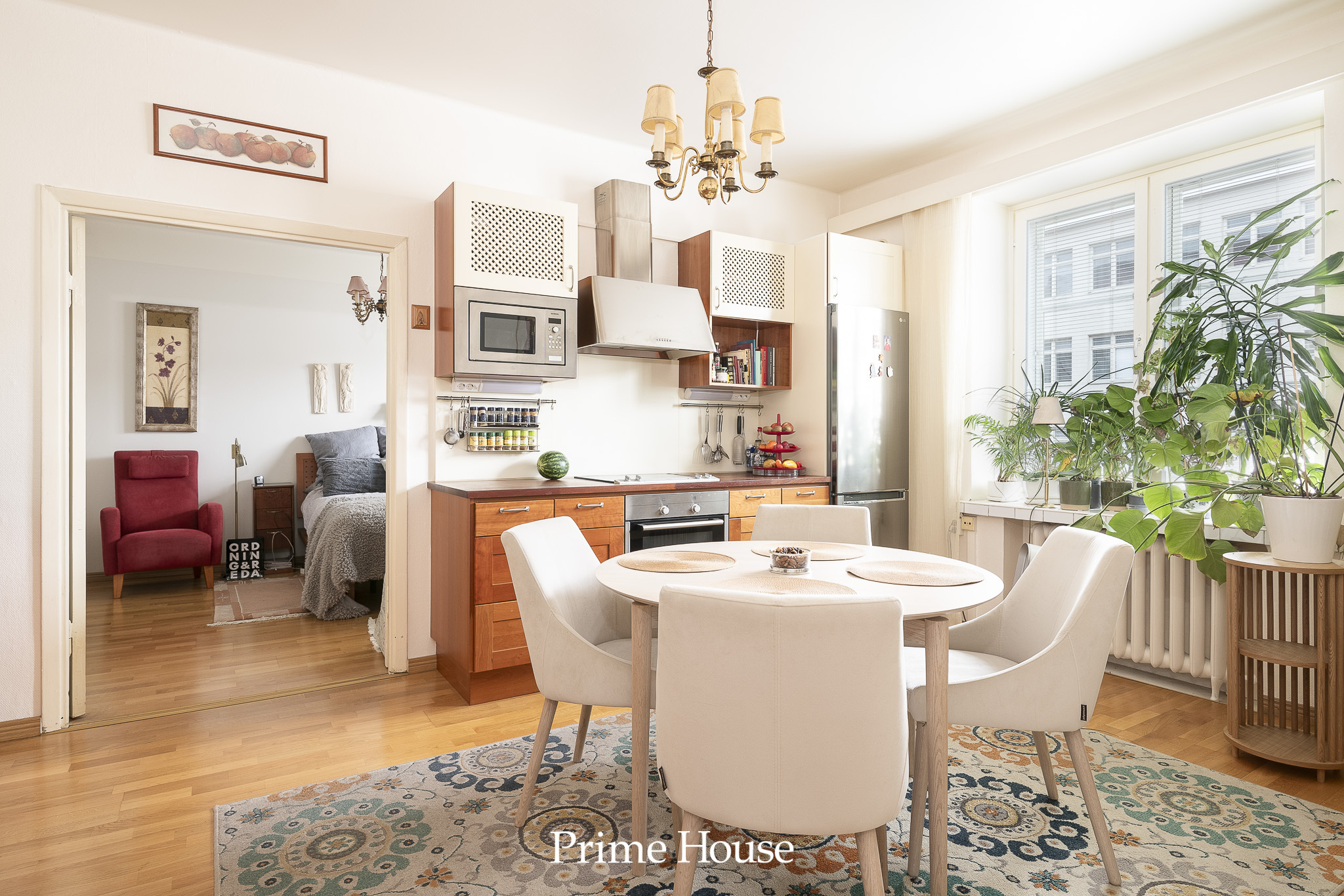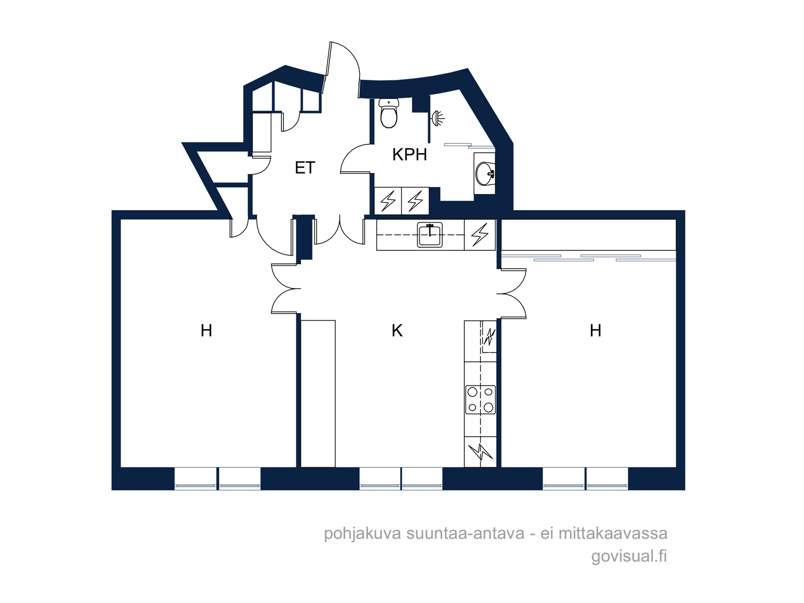 Alkuperäinen sisäänkäynnin ovi toivottaa sinut tervetulleeksi tähän neljännen kerroksen tilaihmeeseen. Lähes 70 neliön kaksio tarjoaa väljyyttä ja toimivan pohjaratkaisun. Asunnosta avautuvat kaupunkinäkymät länteen. Kaikki kolme huonetta ovat lähes samankokoisia mukaan lukien keittiö. Tämän kodin sydän on keskelle sijoittuva keittiö, jossa on tilaa seurusteluun sekä useammallekin kokille. Makuuhuoneessa on mukavasti kaappitilaa koko seinän leveydeltä. Kylpyhuone yllättää toimivuudellaan, kaikki arjen tarpeet ja toiminnat on saatu mahtumaan pyykinpesusta lähtien.