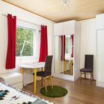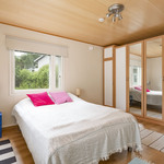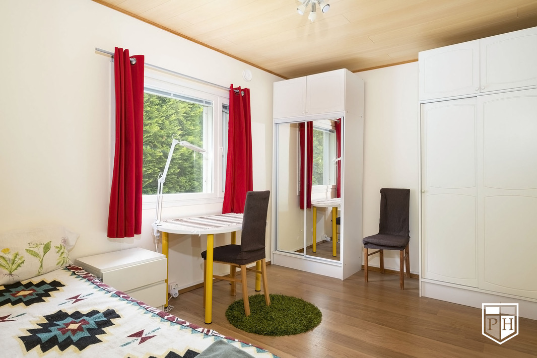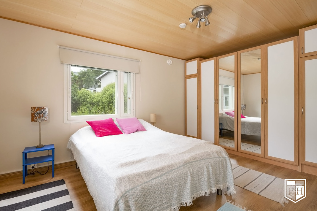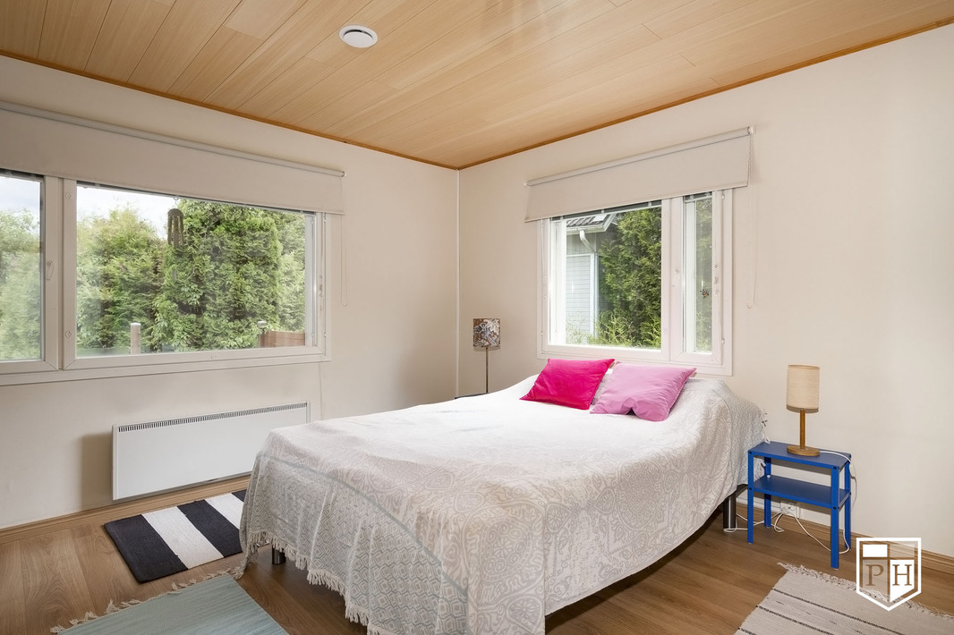 Makuuhuoneen kuvaus Kolme makuuhuonetta ja iso takkahuone, joka soveltuu vaikka päämakuuhuoneeksi. Takkahuoneessa varaava takka, käynti terassille. Makuuhuoneissa kaapisto. Lattia laminaattia.
