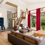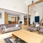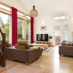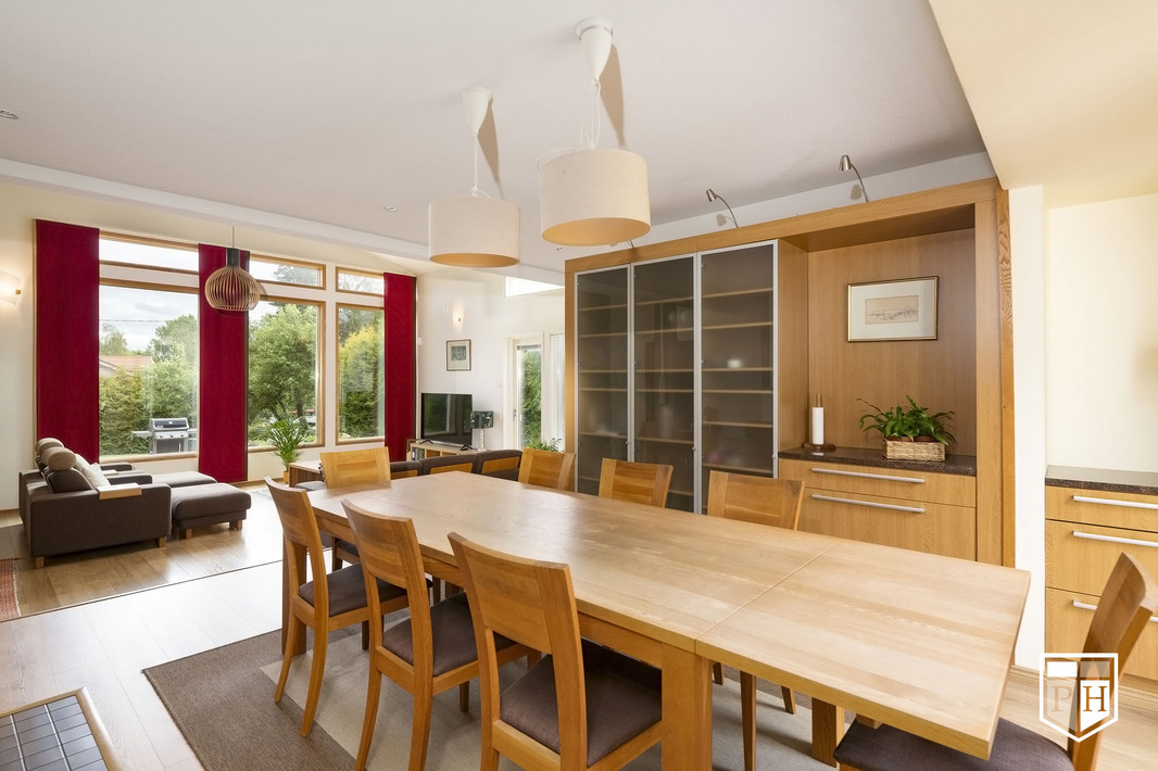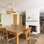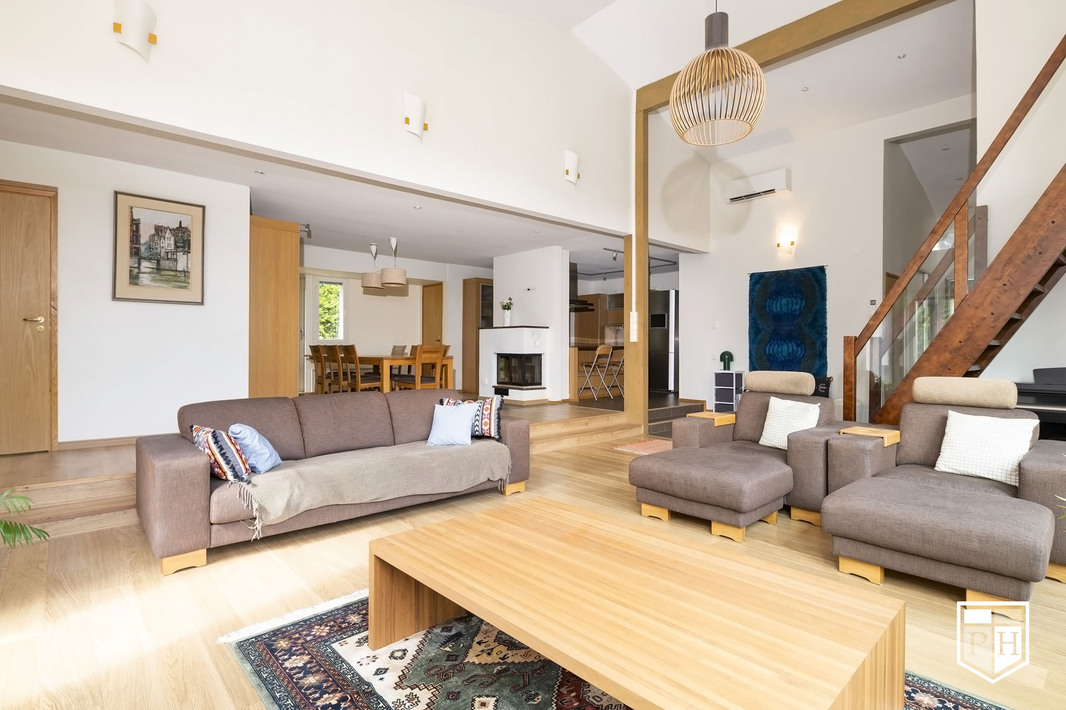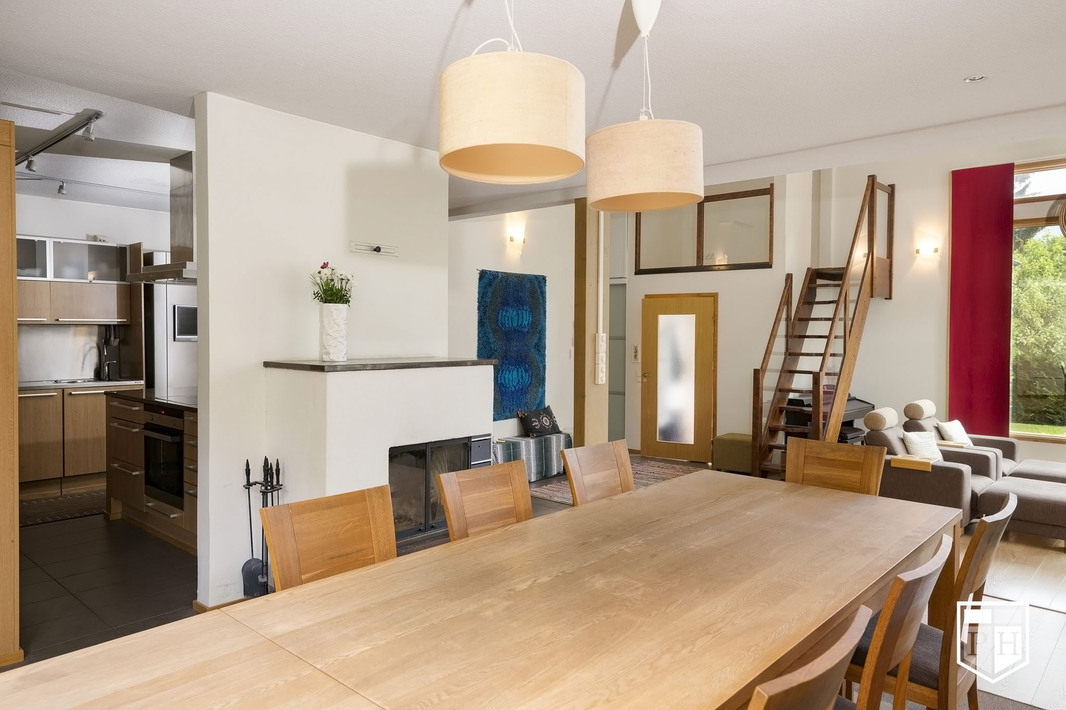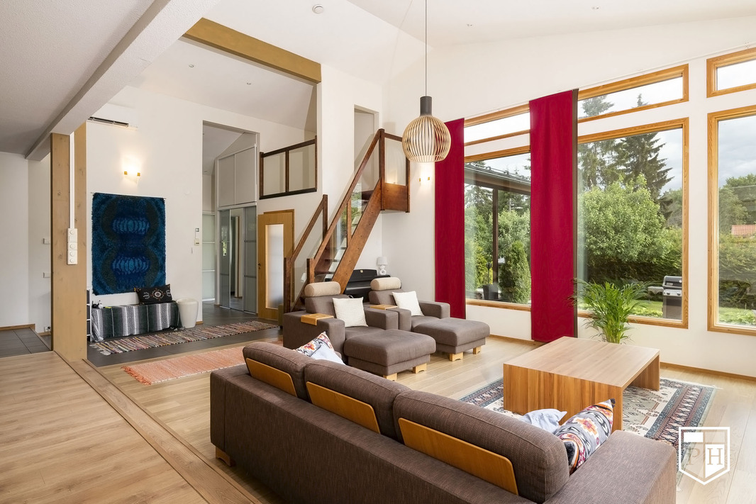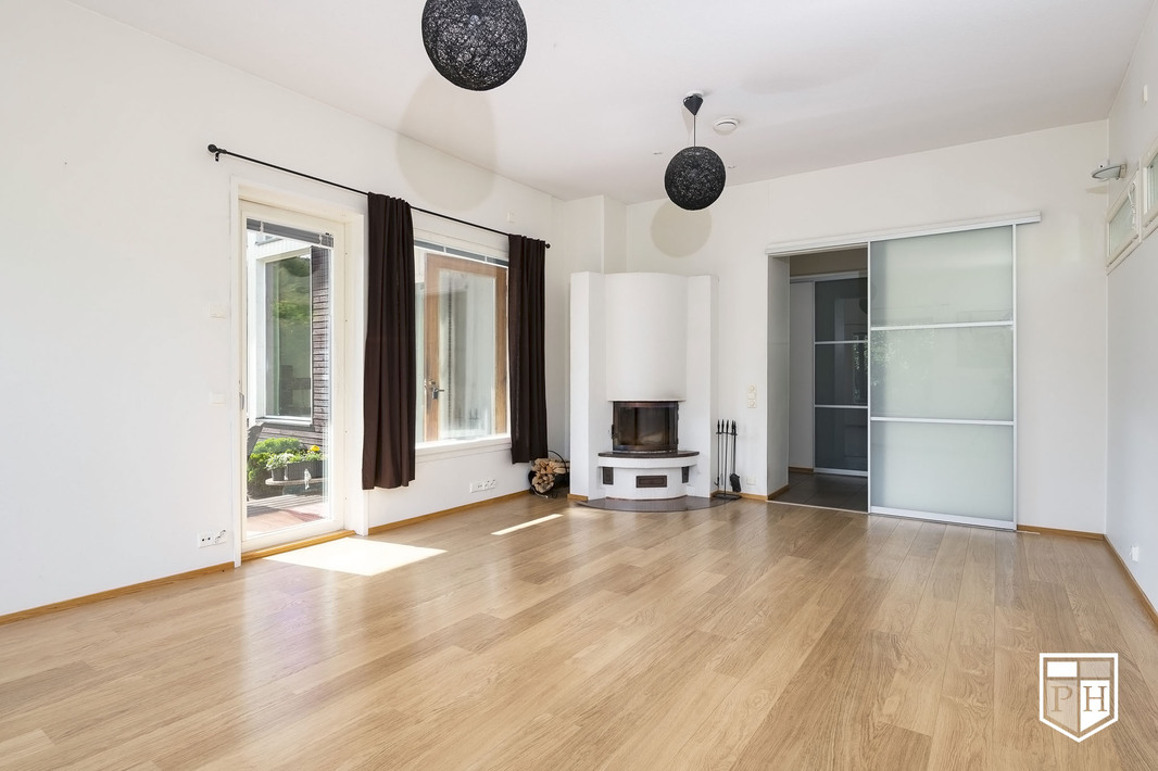 Kodin keskipiste on eteisen jatkeena: iso olohuone ja pari askelmaa ylempänä ruokailutila takkoineen, josta käynti takaterassille. Olohuoneeseen erityistä lumoa tuovat eteläterassille katsovat isot maisemaikkunat, korkea viistokatto ja pikanttina lisänä portaikko pienelle oleskeluparvelle. Takkahuoneessa varaava tulisija tuo tunnelman lisäksi säästöä lämmityskuluihin.