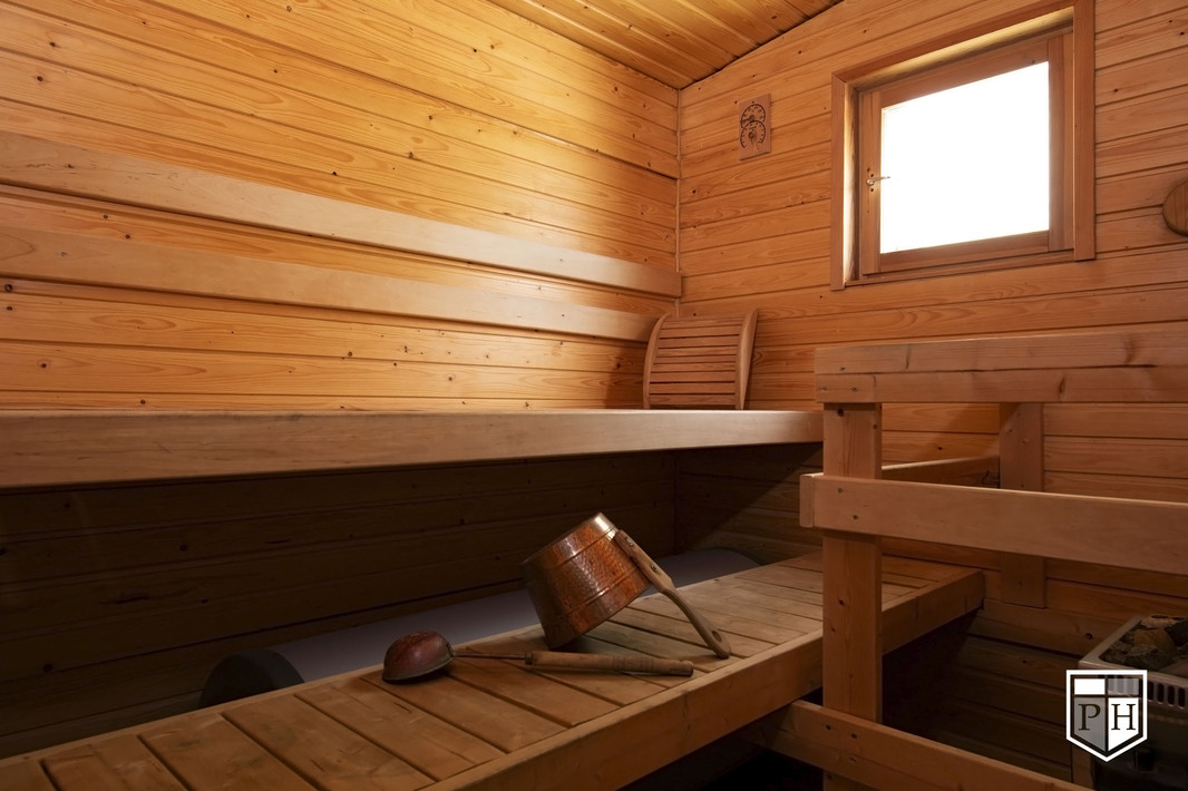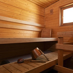Saunan kuvaus Ikkunallinen sauna, jossa sähkökiuas. Lattia laattaa.
