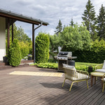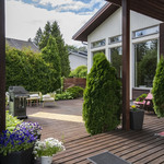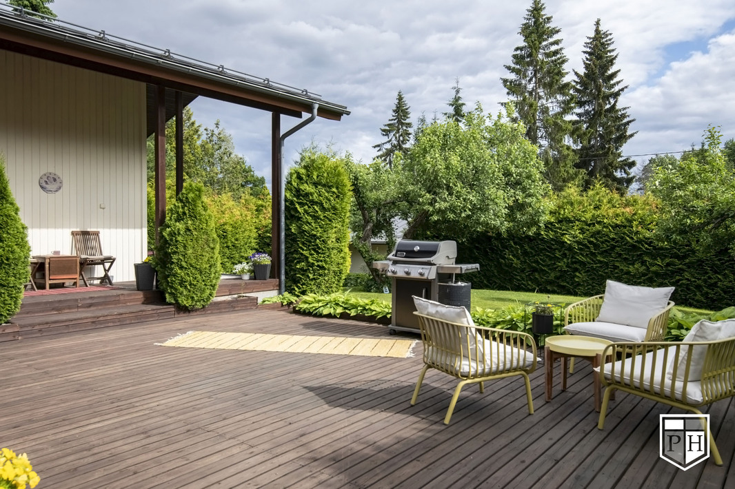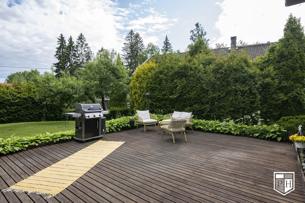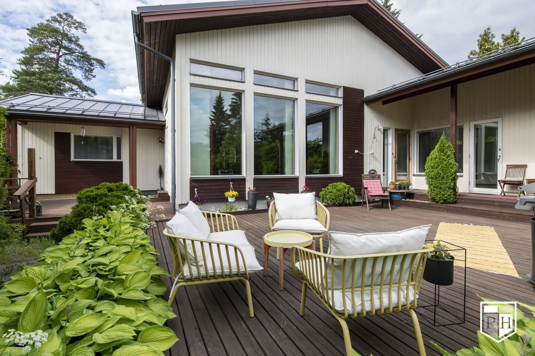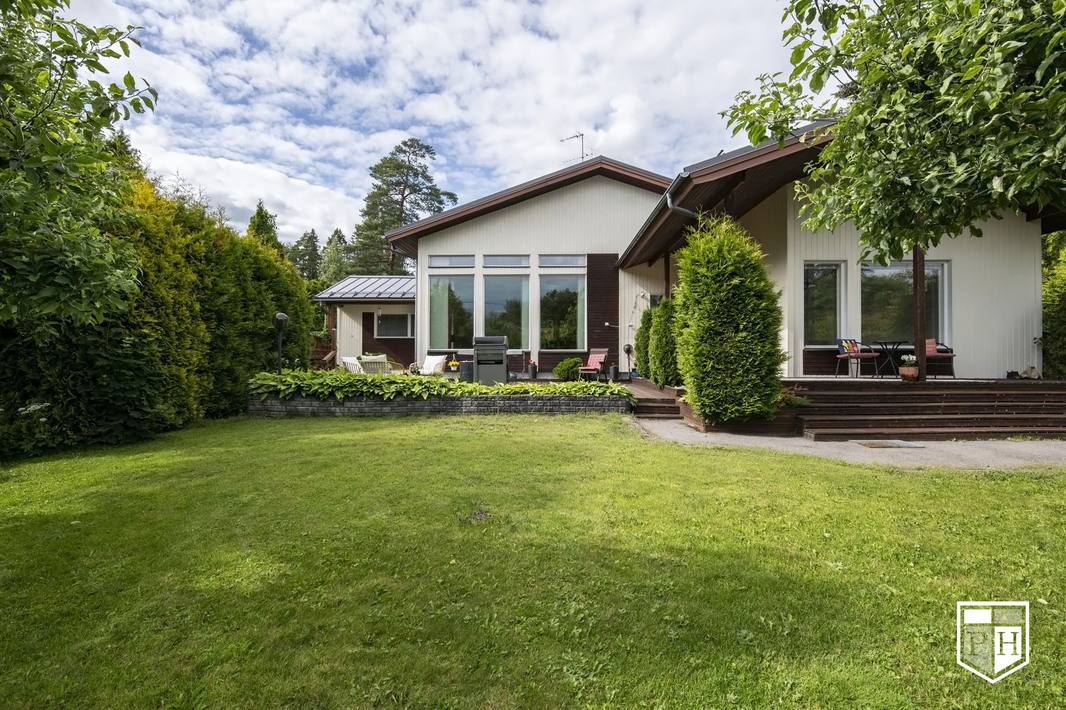 Ihanat ja osin katetut terassialueet kehystävät taloa, ja rakkaudella kasvatetussa puutarhassa kukoistavat perennat, hedelmäpuut ja pensaat. Muurikiveykset kehystävät istutuksia ja tuuhea pensasaita isoa tonttia. Pihan aidattu etuosa on asfaltoitu, kaksipaikkaisen autokatoksen yhteydessä on tilava lämmin varasto.