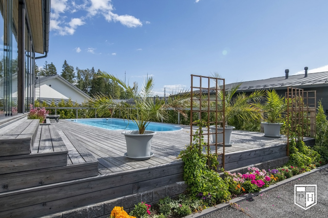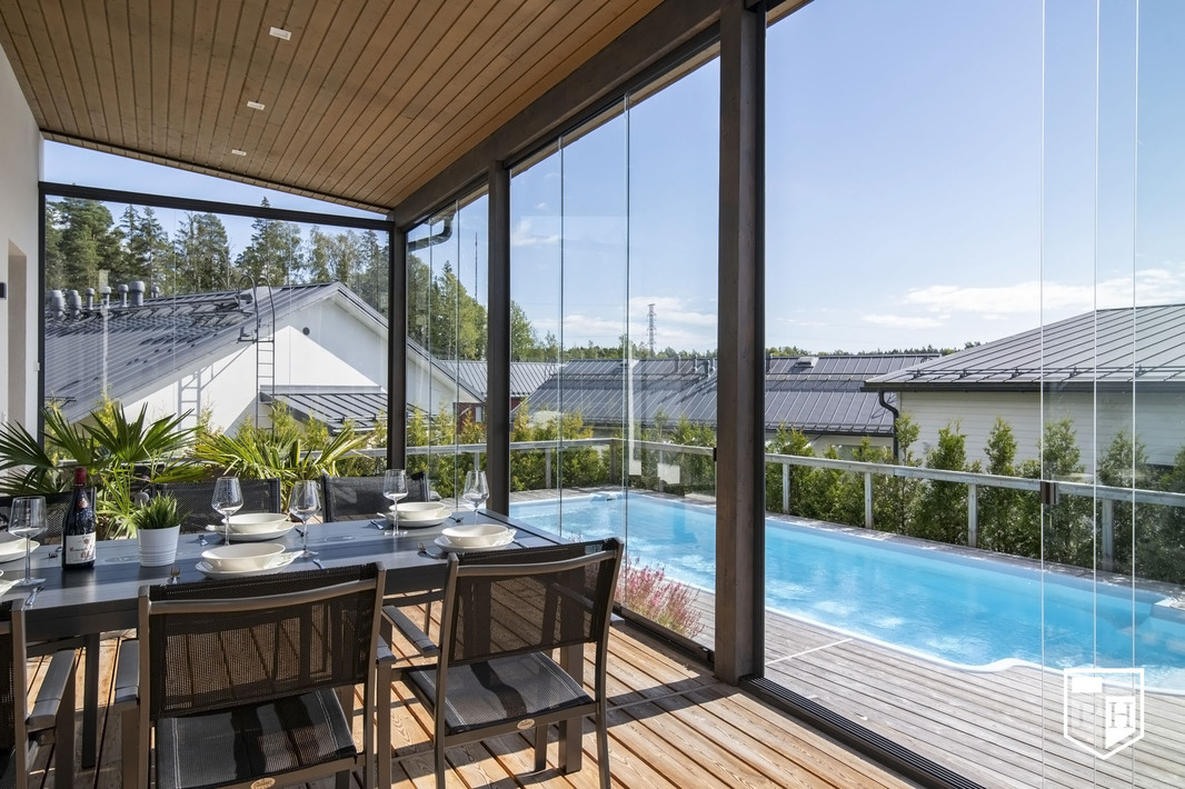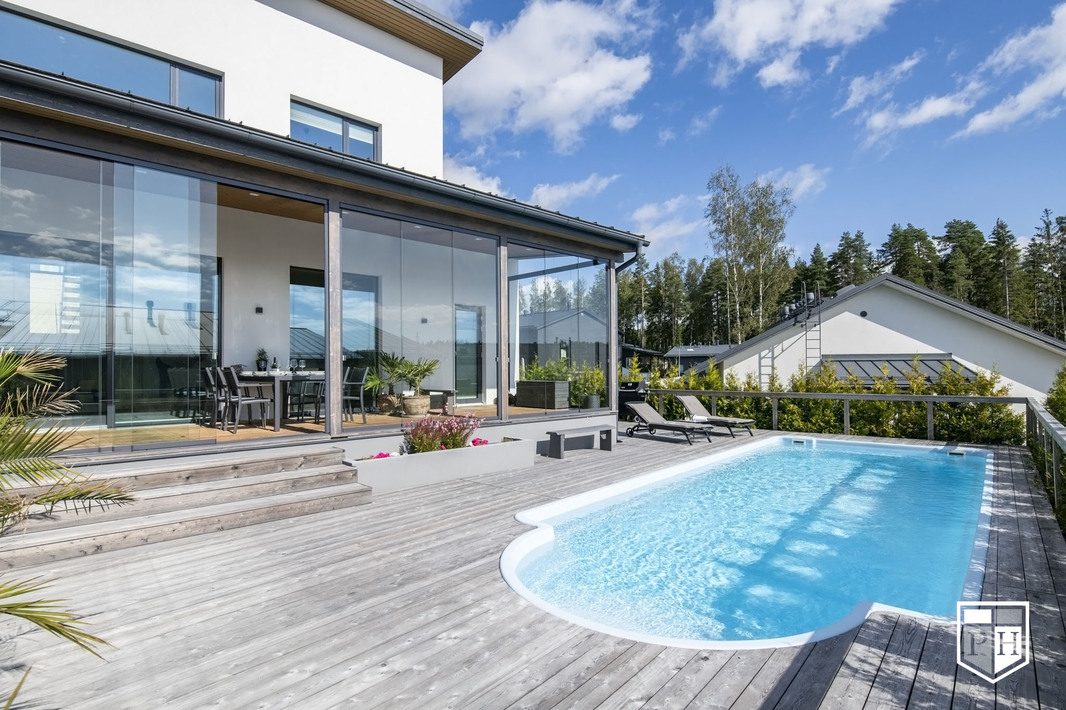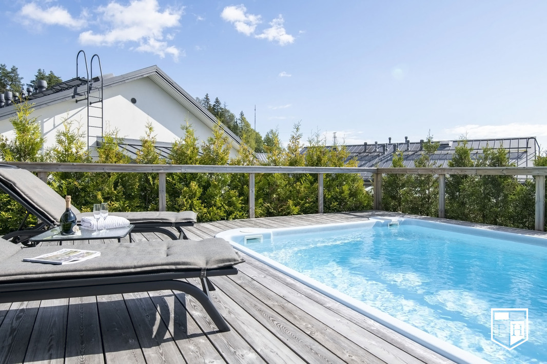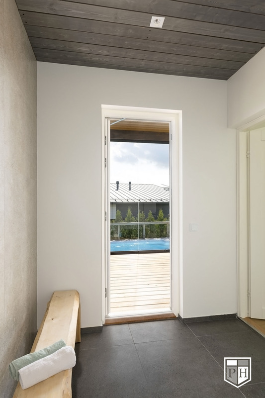 Saunaosasto on arjen hemmottelua parhaimmillaan: haapalankusta valmistetut lauteet, lasipinnat ja Damixan sadesuihkut luovat harmonisen ja modernin tunnelman. Saunasta on käynti tilavalle, noin 30 m² lasiterassille sekä isolle avoterassille, jolta löytyy uima-allas – täydellinen paikka rentoutumiseen ja yhdessäoloon. Uima-altaan lämmityksestä huolehtii oma ilmalämpöpumppu.
