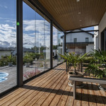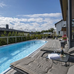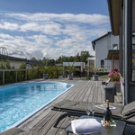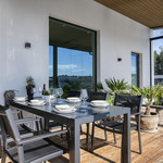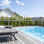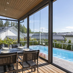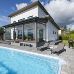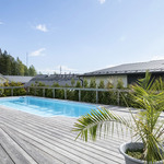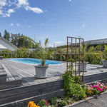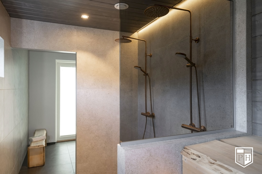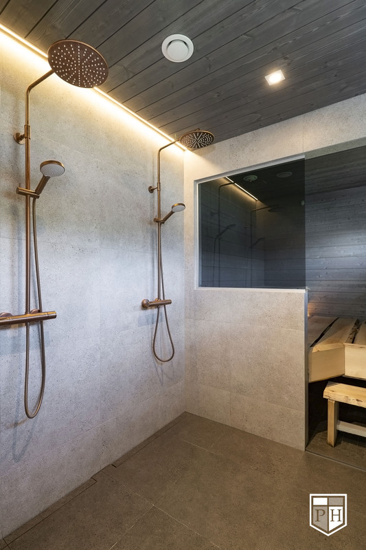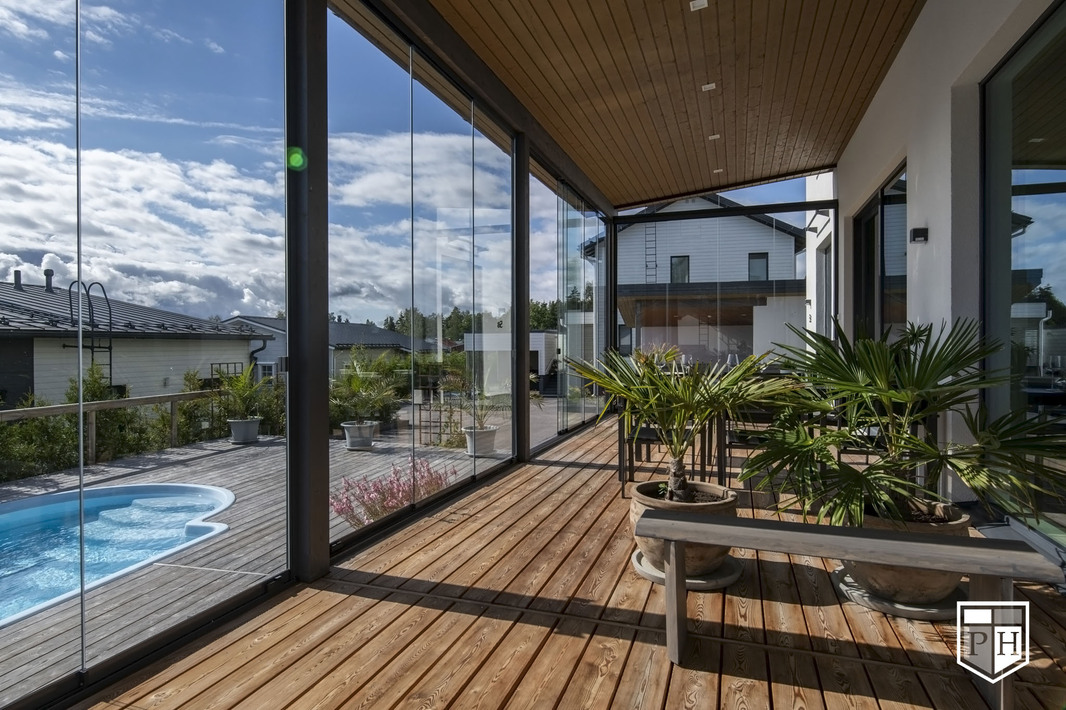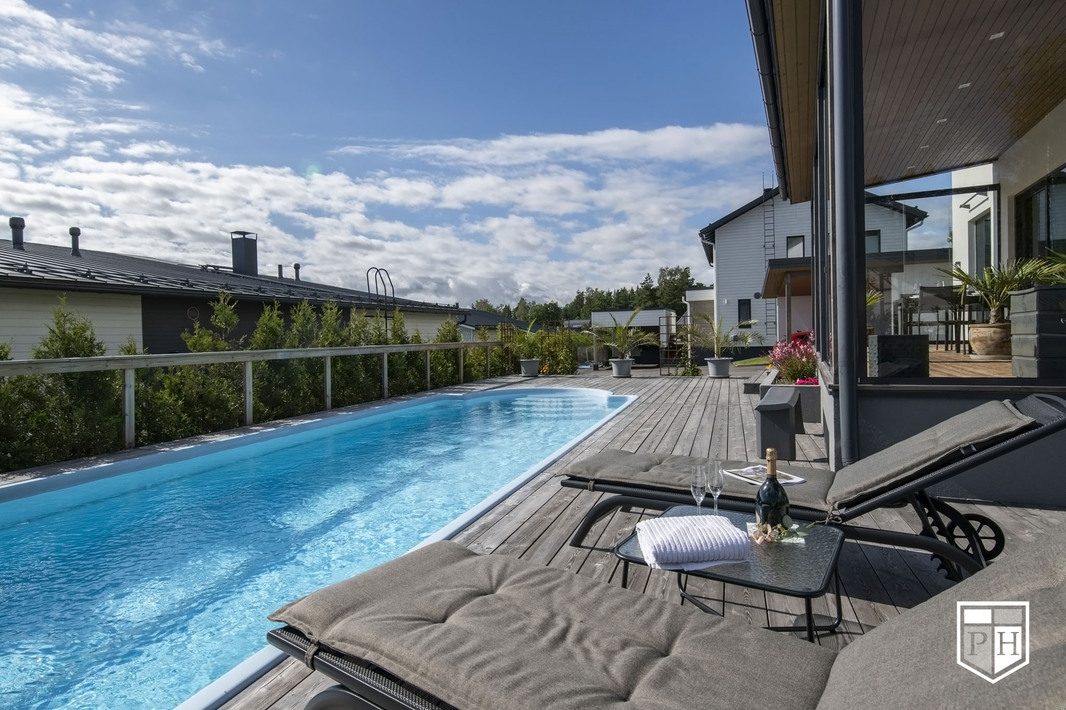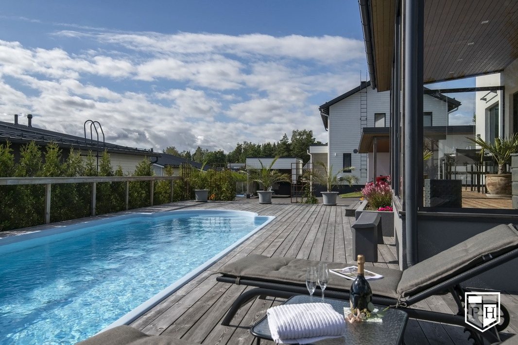 Saunaosasto on arjen hemmottelua parhaimmillaan: haapalankusta valmistetut lauteet, lasipinnat ja Damixan sadesuihkut luovat harmonisen ja modernin tunnelman. Saunasta on käynti tilavalle, noin 30 m² lasiterassille sekä isolle avoterassille, jolta löytyy uima-allas – täydellinen paikka rentoutumiseen ja yhdessäoloon. Uima-altaan lämmityksestä huolehtii oma ilmalämpöpumppu.