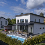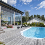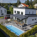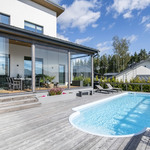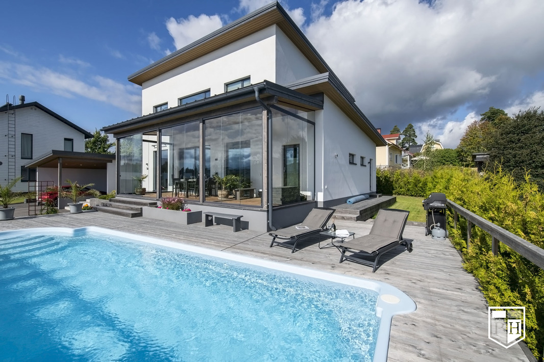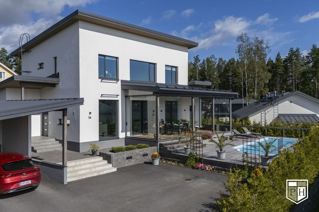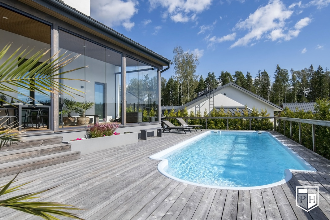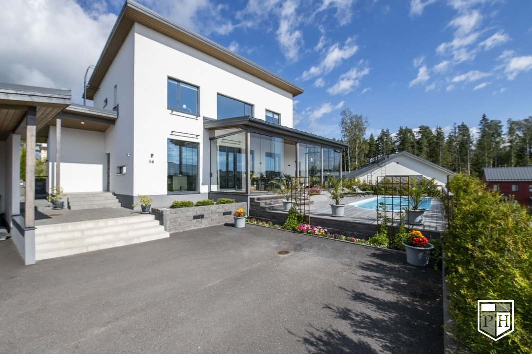Omakotitalo 6 h, k, rt, khh, kph/wc, erill. wc, saunaosasto, 3 x vh, uima-allas, 2 x var + autokatos