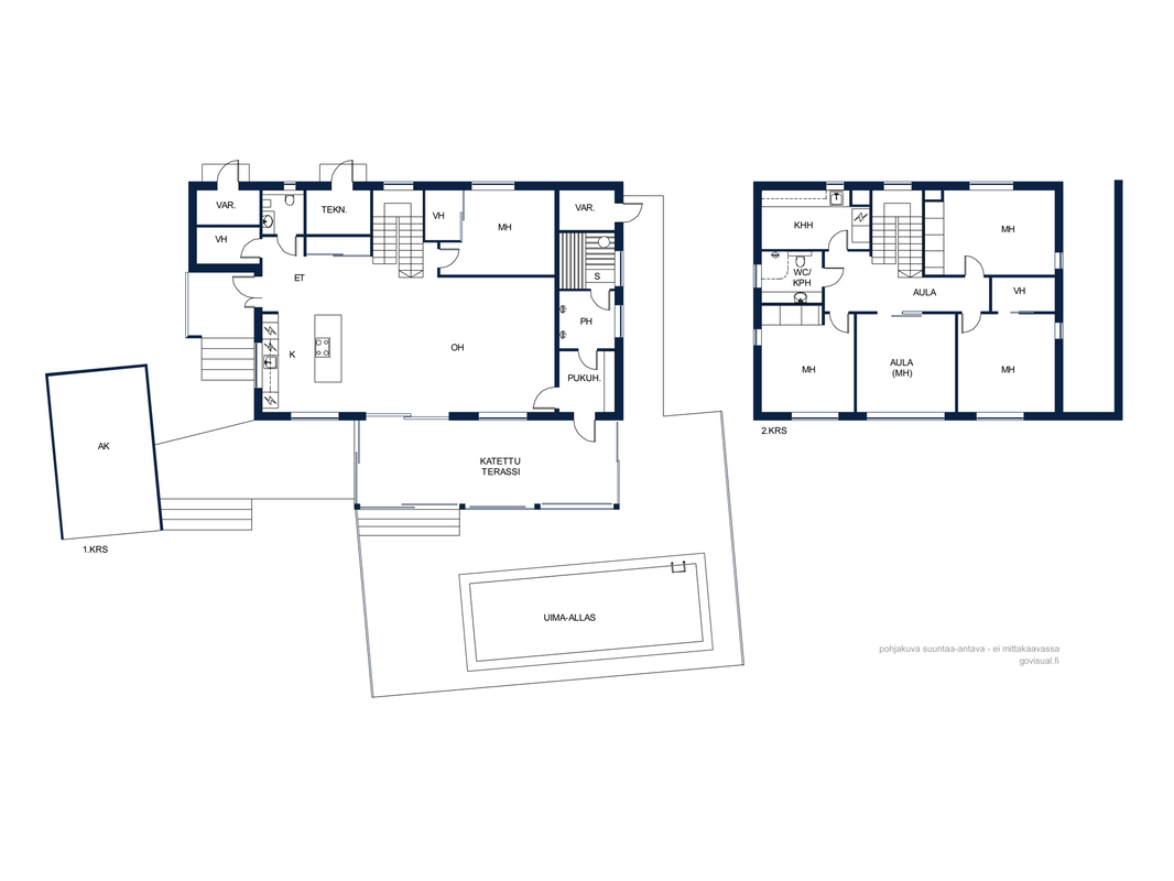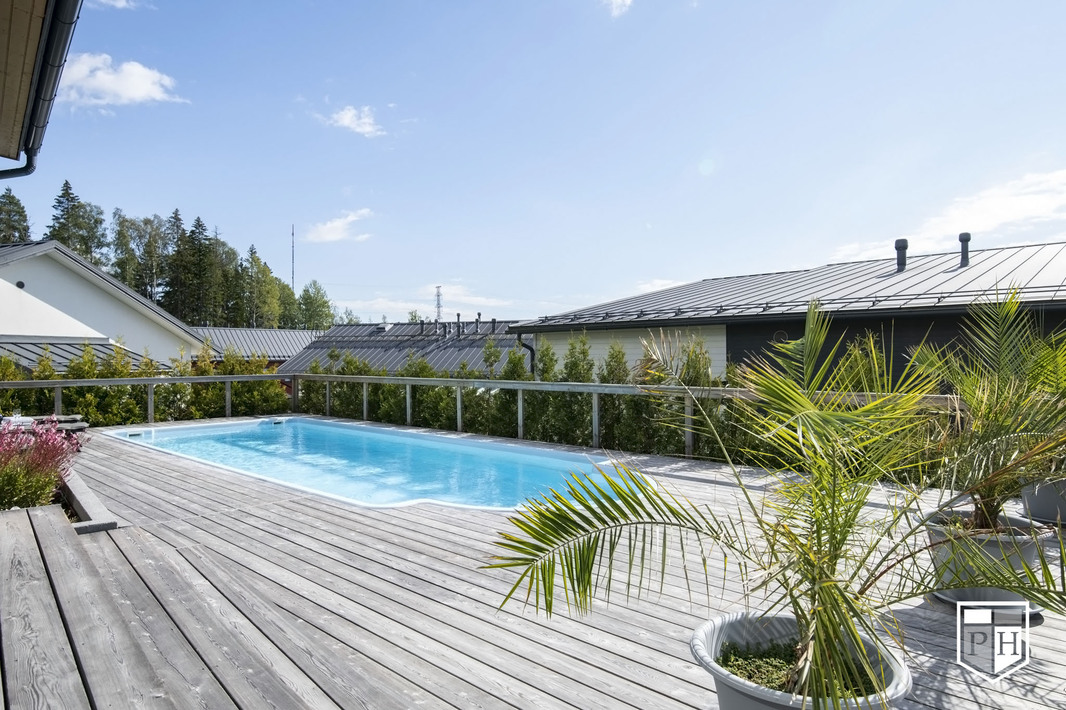 | Huoneistoselitelmä | 6 h, k, rt, khh, kph/wc, erill. wc, saunaosasto, 3 x vh, uima-allas, 2 x var + autokatos |