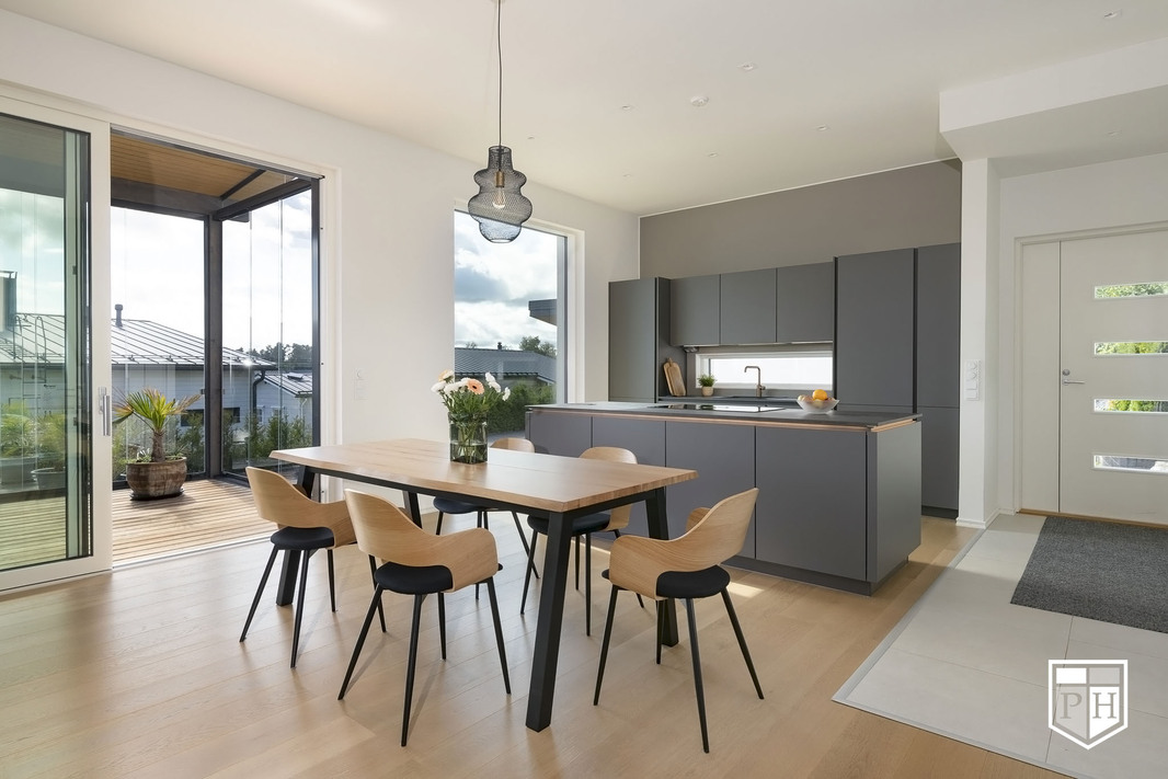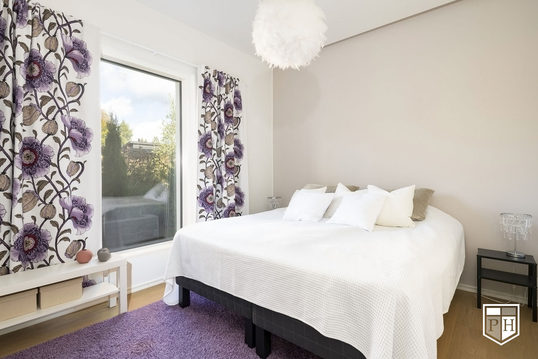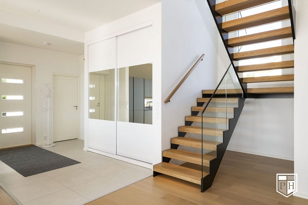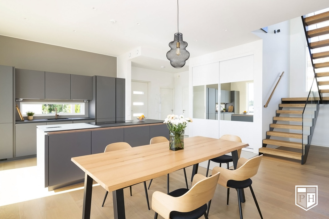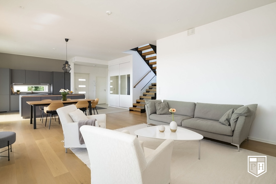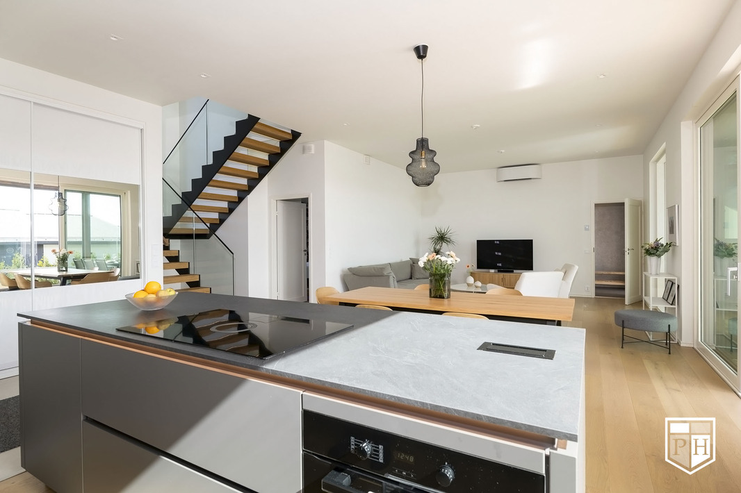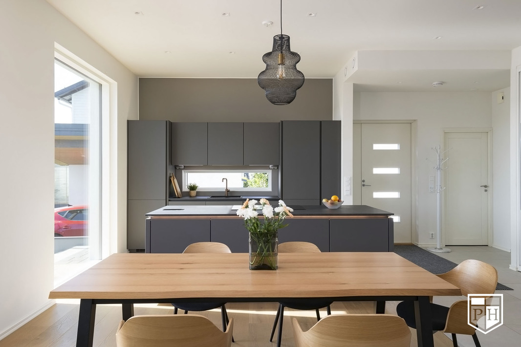 Kodin pohjaratkaisu on huolella suunniteltu – jokainen huone on tilava ja toimiva. Alakerran lähes kolmen metrin huonekorkeus ja suuret ikkunat tuovat tilaan runsaasti luonnonvaloa ja korostavat selkeää, modernia linjakkuutta. Harmoniset sävyt ja viimeistellyt materiaalivalinnat luovat rauhallisen ja tyylikkään kokonaisuuden.