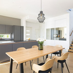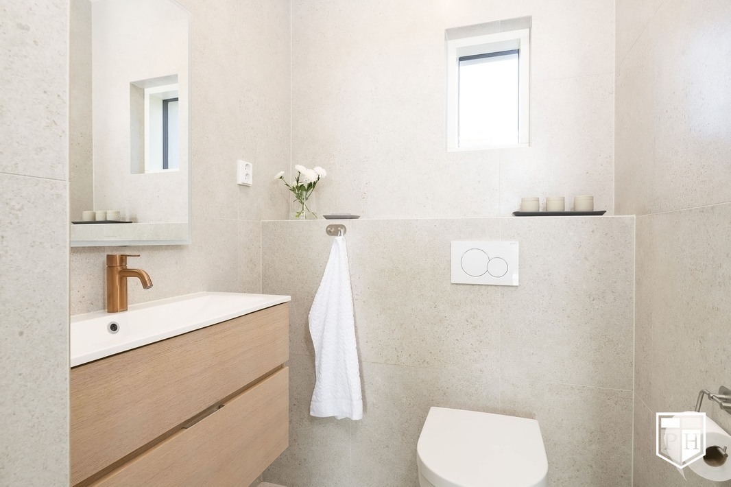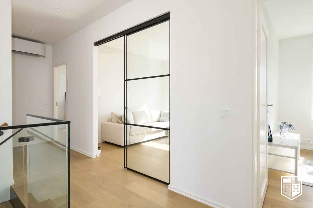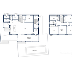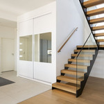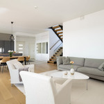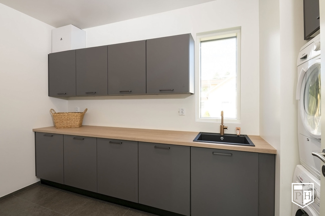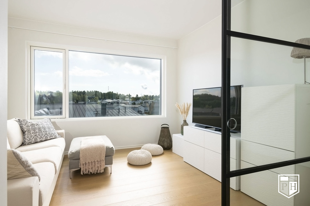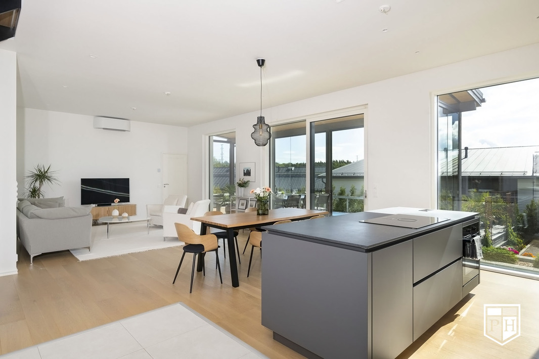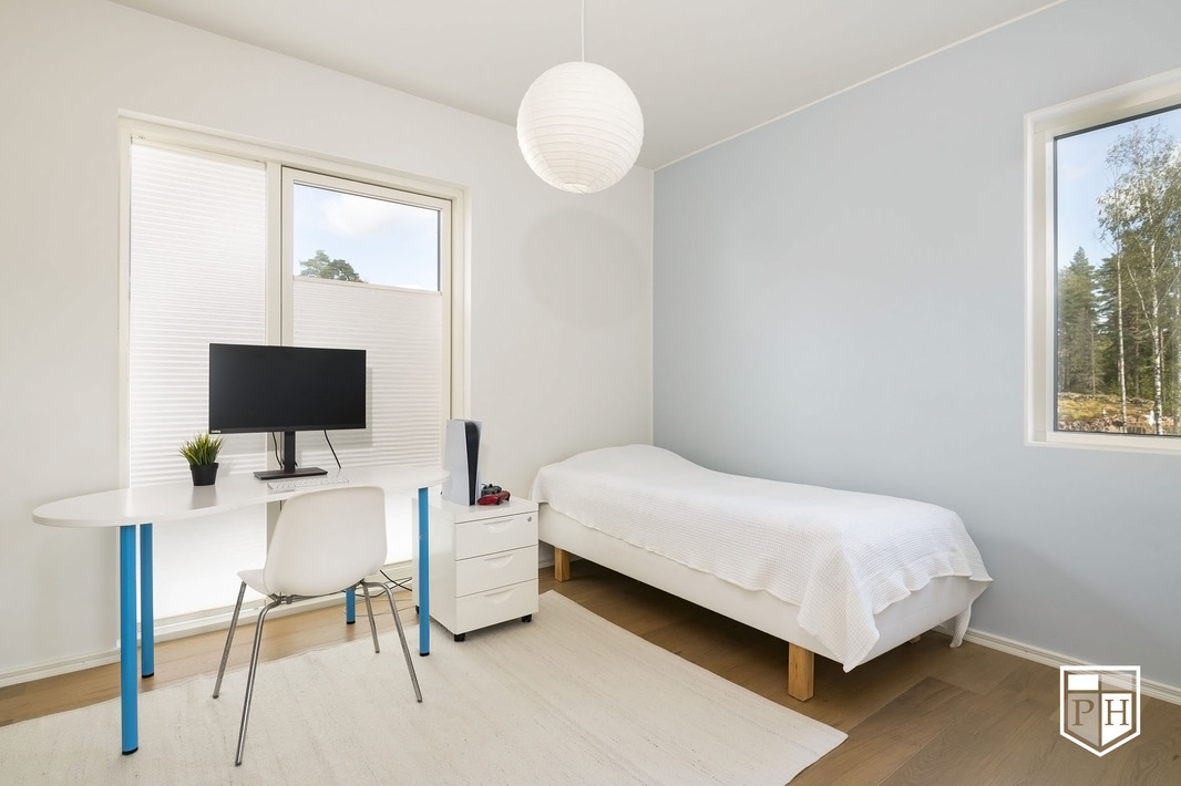Kodin pohjaratkaisu on huolella suunniteltu – jokainen huone on tilava ja toimiva. Alakerran lähes kolmen metrin huonekorkeus ja suuret ikkunat tuovat tilaan runsaasti luonnonvaloa ja korostavat selkeää, modernia linjakkuutta. Harmoniset sävyt ja viimeistellyt materiaalivalinnat luovat rauhallisen ja tyylikkään kokonaisuuden.