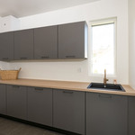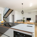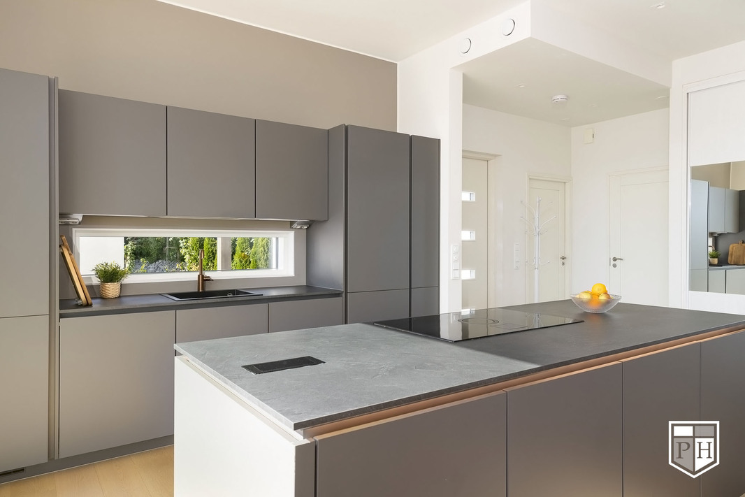 | Keittiön varustelu | Noblessan vetimettömät LineN kaapistot, Slimline laminaattitasot. Yläkaappien alla integroitu työtasovalaistus. Saarekkeessa integroitu valaistus ja Slimline työtaso. Damixan kuparihana. Mielen integroitu pakastin, täysintegroitu astianpesukone, integroitu jääkappi, kalusteuuni kiertoilma- ja grillitoiminnolla. Elican induktioliesitaso NIKOLA TESLA SWITCH F tuulettimella. Lattia kovapuuta. |
