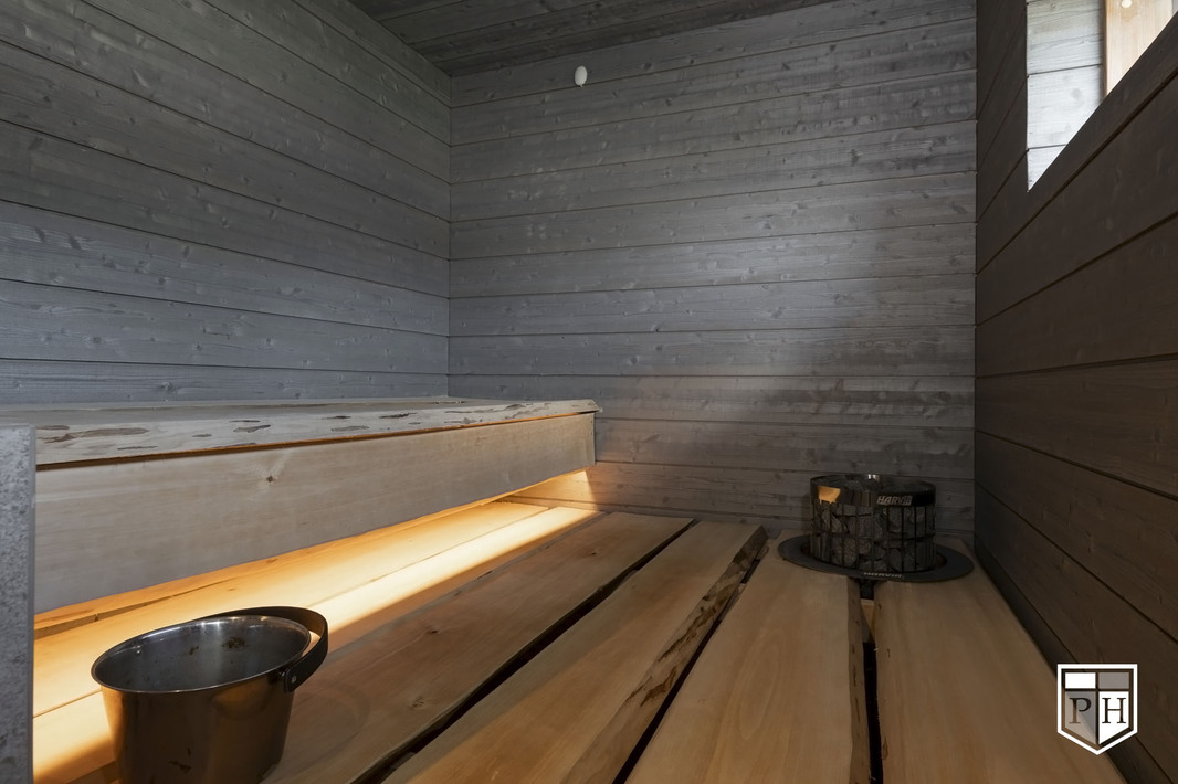 | Saunan kuvaus | Lauteet haapalankkua. Paneelit Siparila struktuuri. Kiuas Harvia Cilindro. Lasiovi ja -seinäke. LED-valot. Lattia laattaa. |