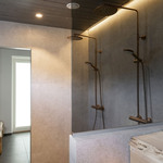 | Kylpyhuoneen kuvaus | 1. krs: pesuhuone/paneelit Siparila struktuuri. Valaistu saippuasyvennys. 2 x Damixa sadesuihku. Seinät ja lattia laattaa. 2. krs: kylpyhuone/Noblessan allaskaappi ja Svedsbergin peilikaappi, Gustavsbergin seinä-wc, Damixan kuparihana, Damixan sadesuihku. Seinät ja lattia laattaa. |
