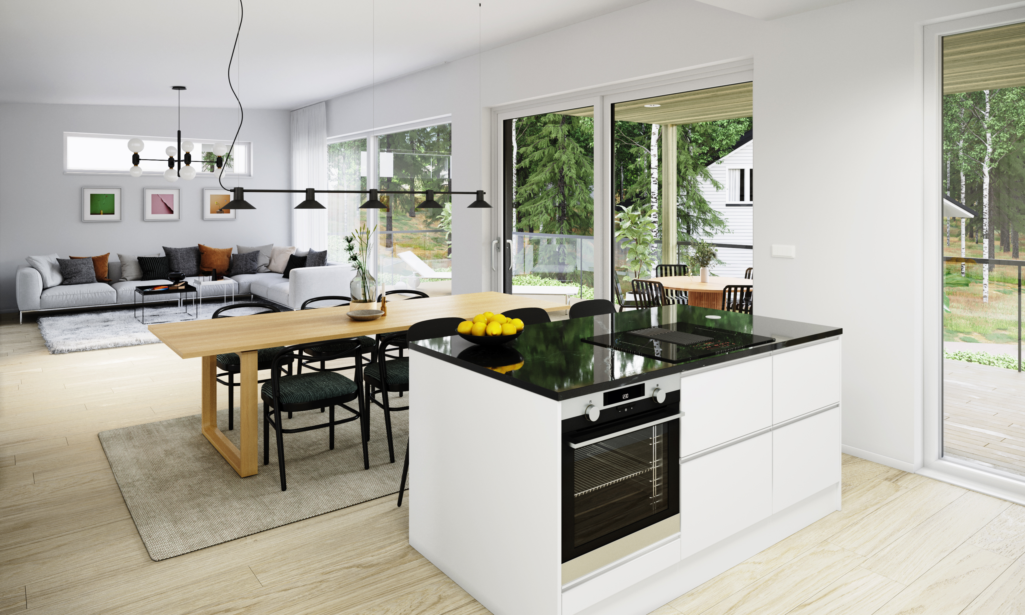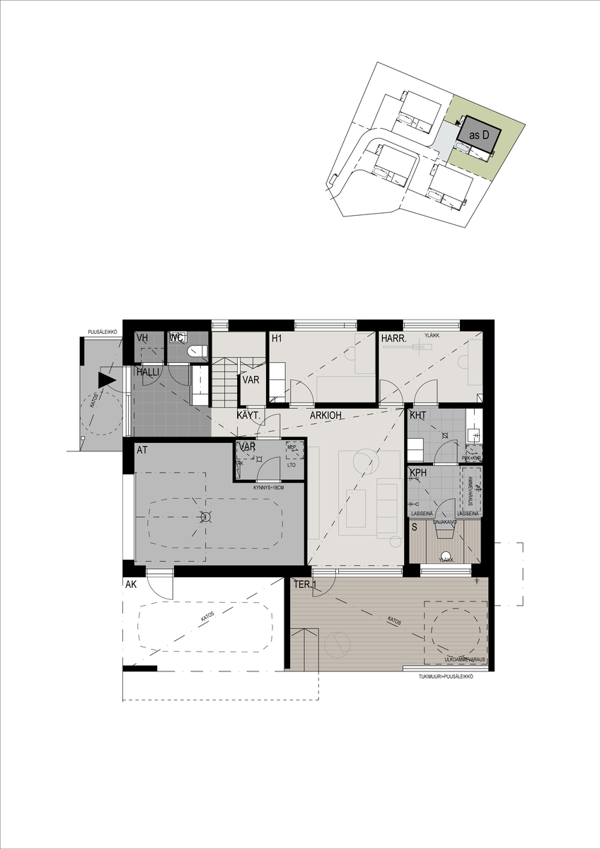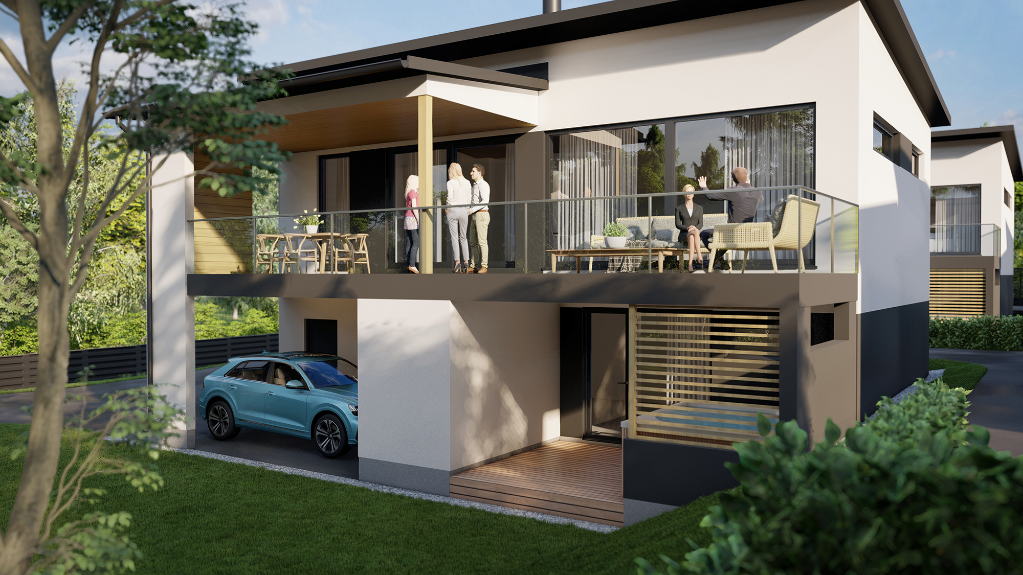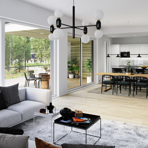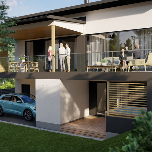Avarassa aulassa lasten pukeminen käy leikiten ja viereisessä kodinhoitohuoneessa hoidellaan sujuvasti pyykit ja kurakengät. Autotallista ja -katoksesta pääsee kuivin kengin suoraan alakertaan. Kaksi makuuhuonetta tarjoaa omaa rauhaa perheen nuorille tai etätyöpäiviin. Saunatiloja avartaa lasiseinä löyly- ja pesuhuoneen välissä. Sadesuihkuja on kaksi ja löylyhuoneessa tuuletusikkuna. Arkiolohuoneesta mennään suojaisalle terassille vilvoittelemaan löylyjen lomassa. Upean aurinkoisessa yläkerrassa Poggenpohlin -saarekekeittiö, ruokailutila ja olohuone ovat yhtenäistä tilaa. Liesisaarekkeen äärellä on mukavaa kokkailla, saarekkeen äärellä siemaistaan kahvit ja välipalatkin. Seinän kokoiset maisemaikkunat ja lasiliukuovi avautuvat osittain katetulle isolle terassiparvekkeelle. Yläkerran päämakuuhuoneesta on käynti vaatehuoneeseen ja edelleen yläkerran kylpyhuoneeseen. Toinen makuuhuone on keittiön vieressä.