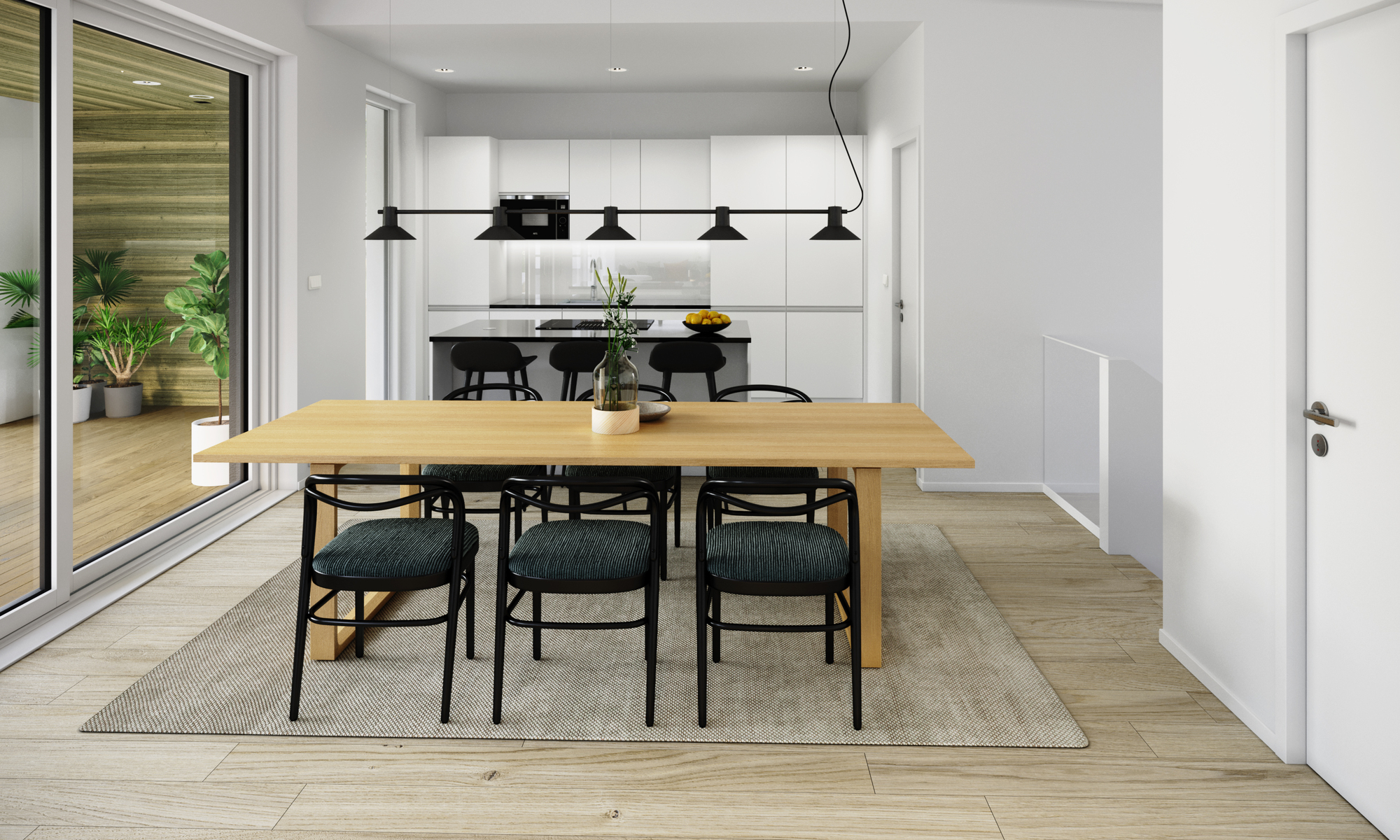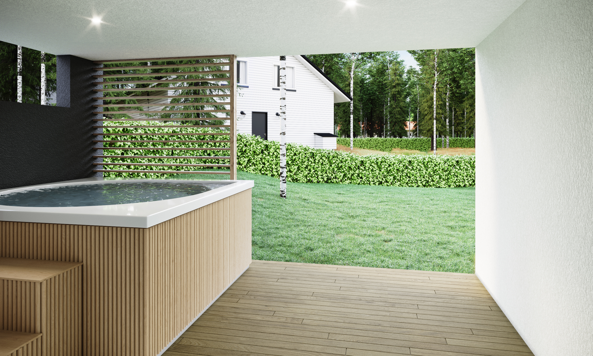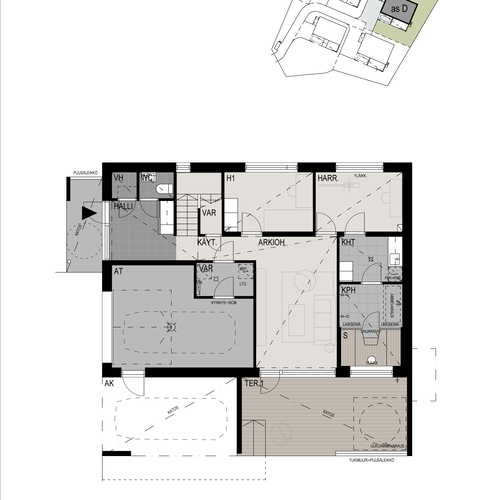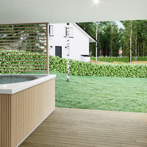 Avarassa aulassa lasten pukeminen käy leikiten ja viereisessä kodinhoitohuoneessa hoidellaan sujuvasti pyykit ja kurakengät. Autotallista ja -katoksesta pääsee kuivin kengin suoraan alakertaan. Kaksi makuuhuonetta tarjoaa omaa rauhaa perheen nuorille tai etätyöpäiviin. Saunatiloja avartaa lasiseinä löyly- ja pesuhuoneen välissä. Sadesuihkuja on kaksi ja löylyhuoneessa tuuletusikkuna. Arkiolohuoneesta mennään suojaisalle terassille vilvoittelemaan löylyjen lomassa. Upean aurinkoisessa yläkerrassa Poggenpohlin -saarekekeittiö, ruokailutila ja olohuone ovat yhtenäistä tilaa. Liesisaarekkeen äärellä on mukavaa kokkailla, saarekkeen äärellä siemaistaan kahvit ja välipalatkin. Seinän kokoiset maisemaikkunat ja lasiliukuovi avautuvat osittain katetulle isolle terassiparvekkeelle. Yläkerran päämakuuhuoneesta on käynti vaatehuoneeseen ja edelleen yläkerran kylpyhuoneeseen. Toinen makuuhuone on keittiön vieressä.