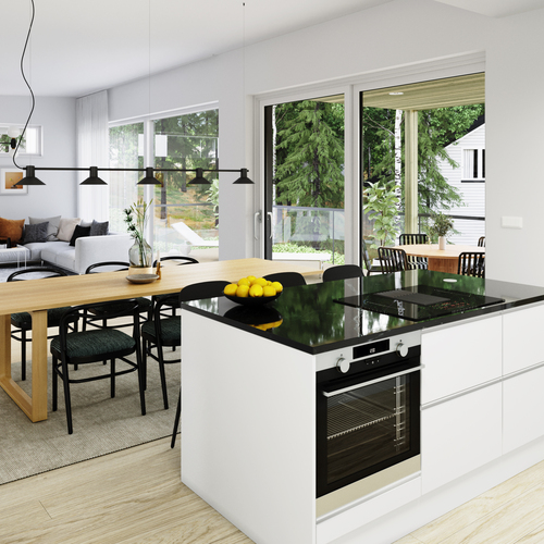 Poggenpohlin keittiö erillisen kalustesuunnitelman mukaan.