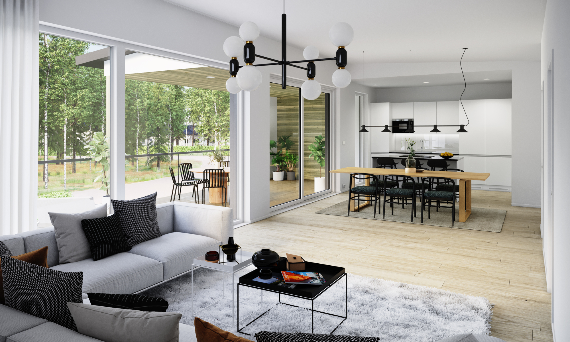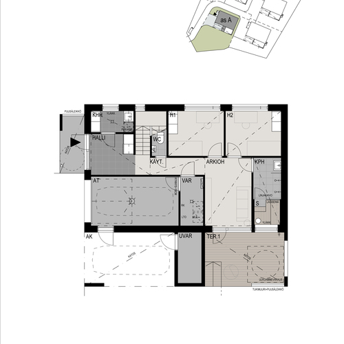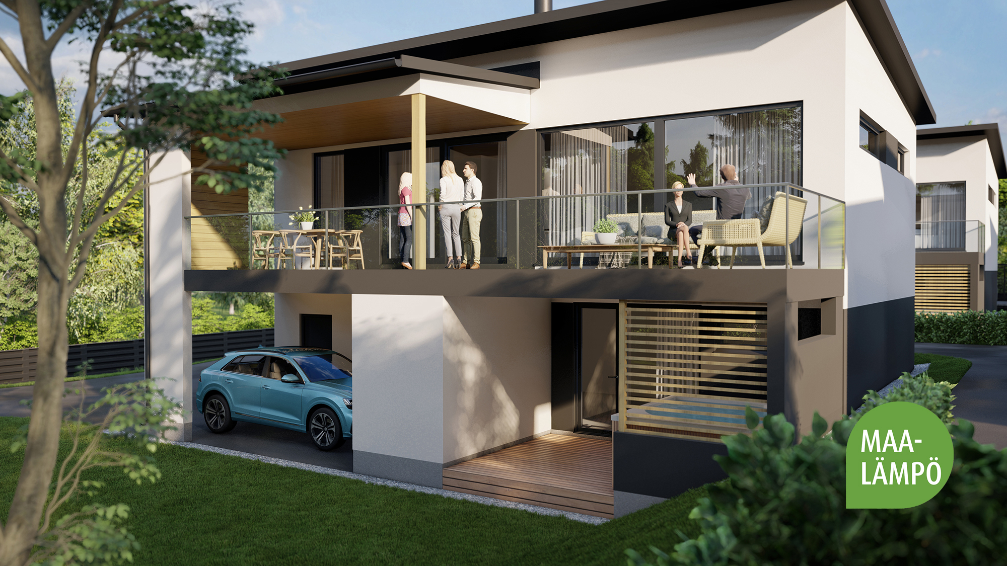 Avarassa aulassa lasten pukeminen käy leikiten ja viereisessä kodinhoitohuoneessa hoidellaan sujuvasti pyykit ja kurakengät. Autotallista ja -katoksesta pääsee kuivin kengin suoraan alakertaan. Kaksi makuuhuonetta tarjoaa omaa rauhaa perheen nuorille tai etätyöpäiviin. Saunatiloja avartaa lasiseinä löyly- ja pesuhuoneen välissä. Sadesuihkuja on kaksi ja löylyhuoneessa tuuletusikkuna. Arkiolohuoneesta mennään suojaisalle terassille vilvoittelemaan löylyjen lomassa. Upean aurinkoisessa yläkerrassa Poggenpohlin -saarekekeittiö, ruokailutila ja olohuone ovat yhtenäistä tilaa. Liesisaarekkeen äärellä on mukavaa kokkailla, saarekkeen äärellä siemaistaan kahvit ja välipalatkin. Seinän kokoiset maisemaikkunat ja lasiliukuovi avautuvat osittain katetulle isolle terassiparvekkeelle. Yläkerran päämakuuhuoneesta on käynti vaatehuoneeseen ja edelleen yläkerran kylpyhuoneeseen. Toinen makuuhuone on keittiön vieressä.
