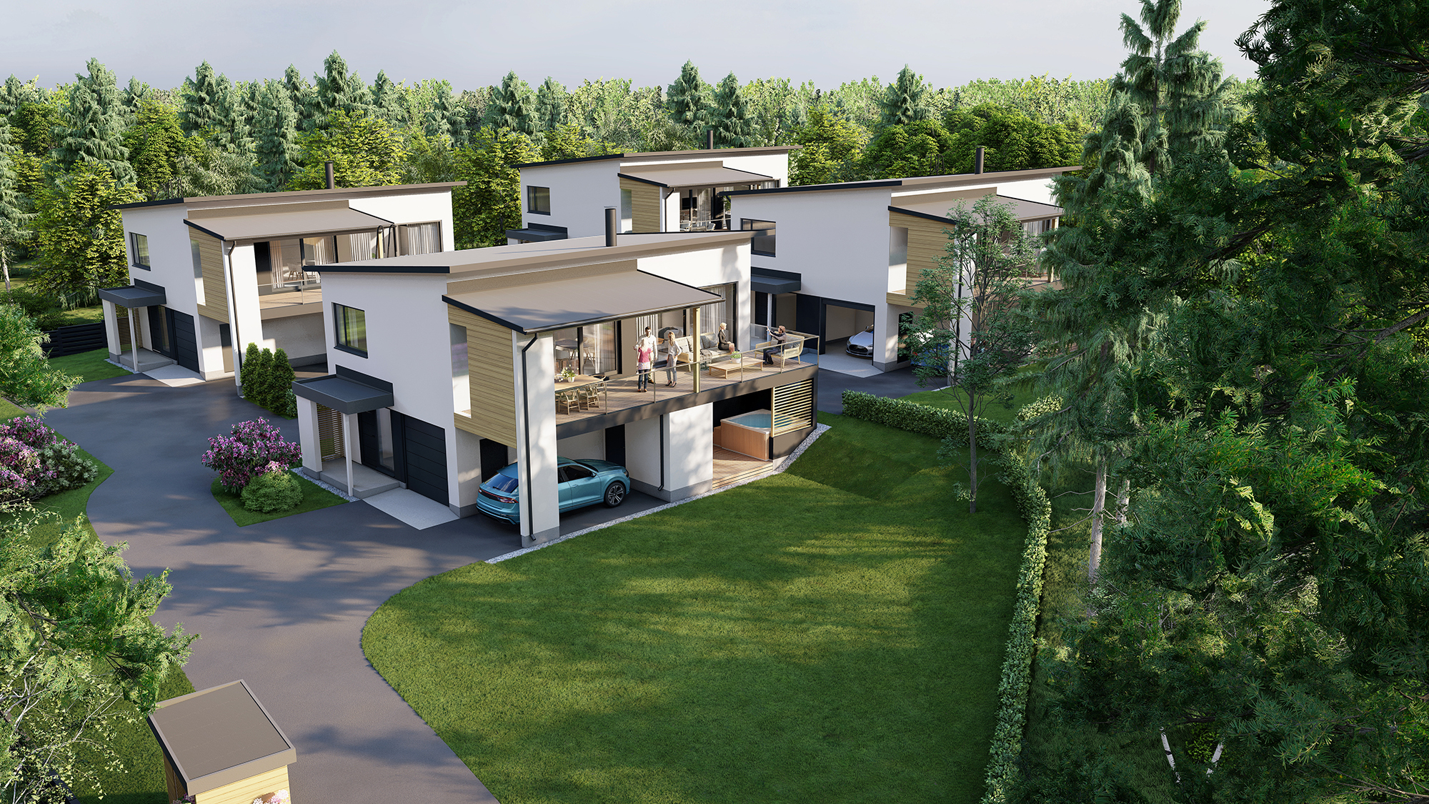Talot C ja D ovat nekin lapsiperheille ihanteellisia. Eteisen yhteydessä on vaatehuone ja pikkuvessa. Autotallista ja -katoksesta on käynti suoraan alakertaan. Makuuhuoneen vieressä on harrastehuone, josta on käynti kodinhoitotilaan ja edelleen saunatiloihin. Pesuhuoneessa on kaksi sadesuihkua ja tilavaraus ammeelle; löylyhuoneessa on vastakkain istuttavat lauteet ja tuuletusikkuna. Arkiolohuoneesta on käynti suojaisalle terassille, jonne saa lisätilauksesta porealtaankin. Yläkerrassa on kolme makuuhuonetta, joista päämakuuhuoneella on oma suihkullinen kylpyhuone ja vaatehuone. Pikkuvessa on lisäksi erikseen. Muutoin yläkerta on kuten A- ja B-taloissa: maisemaikkunoiden valossa kylpevä saarekekeittiön, ruokailutilan ja olohuoneen hurmaava kokonaisuus sekä osittain katettu upea terassiparveke.